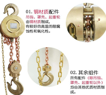 鏈條、導輪、吊鉤等材質的制造材料為鈹青銅或者是鋁青銅,顏色深黃,不易斷裂、不易變形、抗擠壓能力強,防爆等級更高,在和其他機械設備、地面等物種接觸時不會產生火花。